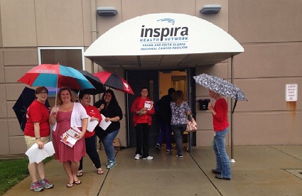 Inspira Nurses Support Their Negotiations Committee Nurses at Inspira hospitals braved the rain today to leaflet their co-workers ahead of bargaining tomorrow. Several unresolved issues remain before a contract settlement can be reached.