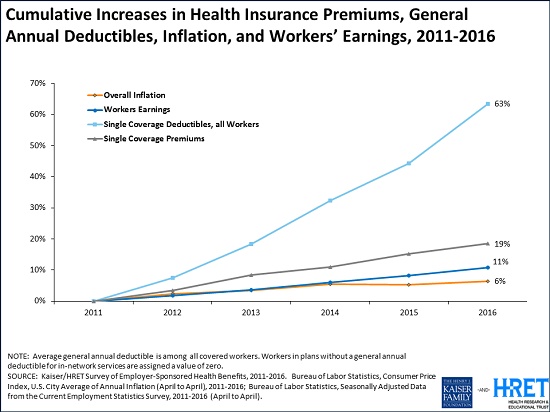 Annual family premiums for employer-sponsored health insurance rose an average of 3 percent to $18,142 this year, a modest increase at a time when workers’ wages (2.5%) and inflation (1.1%) also grew modestly, according to the benchmark Kaiser Family Foundation/Health Research & Educational Trust (HRET) 2016 Employer Health Benefits Survey released today. Workers on average contribute $5,277 annually toward their family premiums.