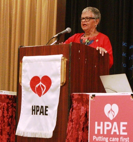 Congresswoman Bonnie Watson Coleman, our keynote speaker, opened up the convention. Watson Coleman praised HPAE for its focus on quality patient care, in particular, our consistent effort to achieve nurse to patient staffing ratios. She discussed the efforts of Republicans in Congress to repeal the Affordable Care Act and to weaken the rights of working people. Watson Coleman urged the convention delegates to help elect candidates for Congress that will support universal healthcare and strong labor unions.