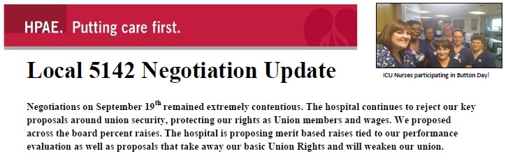 salemContract negotiations which were held last month remained extremely contentious. The hospital continues to reject our key proposals around union security, protecting our rights as Union members and wages. We proposed across the board percent raises. The hospital is proposing merit based raises tied to our performance evaluation as well as proposals that take away our basic Union Rights and will weaken our union.