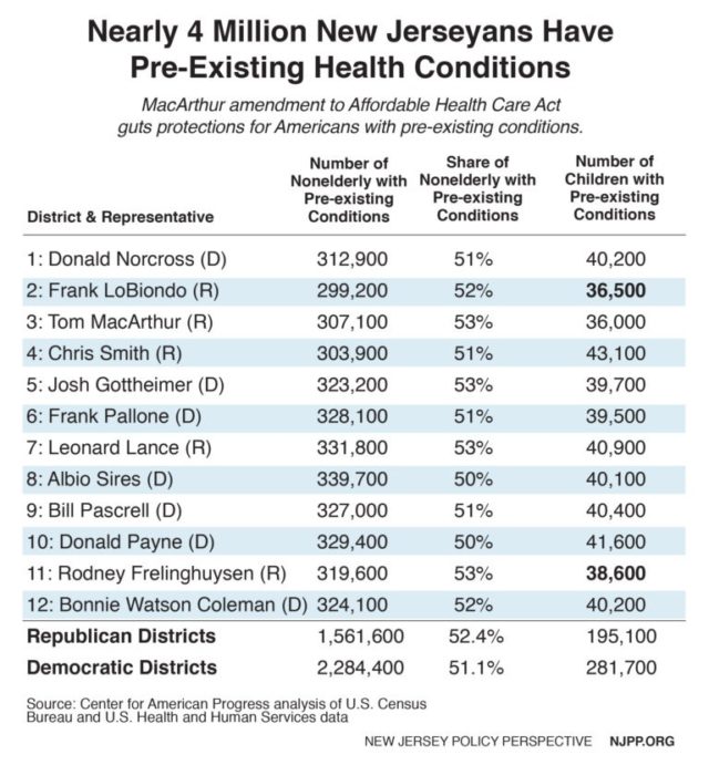 Rep. Tom MacArthur of New Jersey’s 3rd Congressional District – the only member of the state’s Congressional delegation who supported the first iteration of the American Health Care Act – has now resurrected the bill with a new amendment that retains all the worst elements of the original plan to repeal and replace the Affordable Care Act and sharply reduces protections for pre-existing conditions and other health benefits.