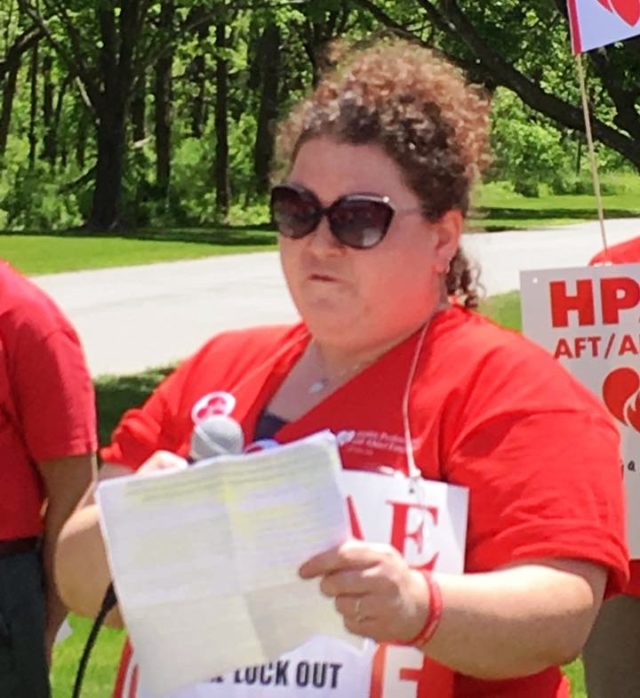 Yesterday, Local 5629 members rallied with members from other HPAE locals, HPAE staff, and union supporters at the entrance to Sunrise House. HPAE President Ann Twomey emphasized our union’s determination to achieve a contract which is good for patients and staff at the facility: “AAC nurses and workers are on the frontlines of the opioid addiction crisis, and are striving to improve safety conditions for patients and workers. This national for-profit chain, AAC, responded with an illegal lock-out, rather than bargain in good faith. Their action is an affront to workers, but also to the residents in need of safe and effective treatment. Despite the lockout, we will continue to bargain for a contract that protects patients and workers,” said Ann Twomey, HPAE President.