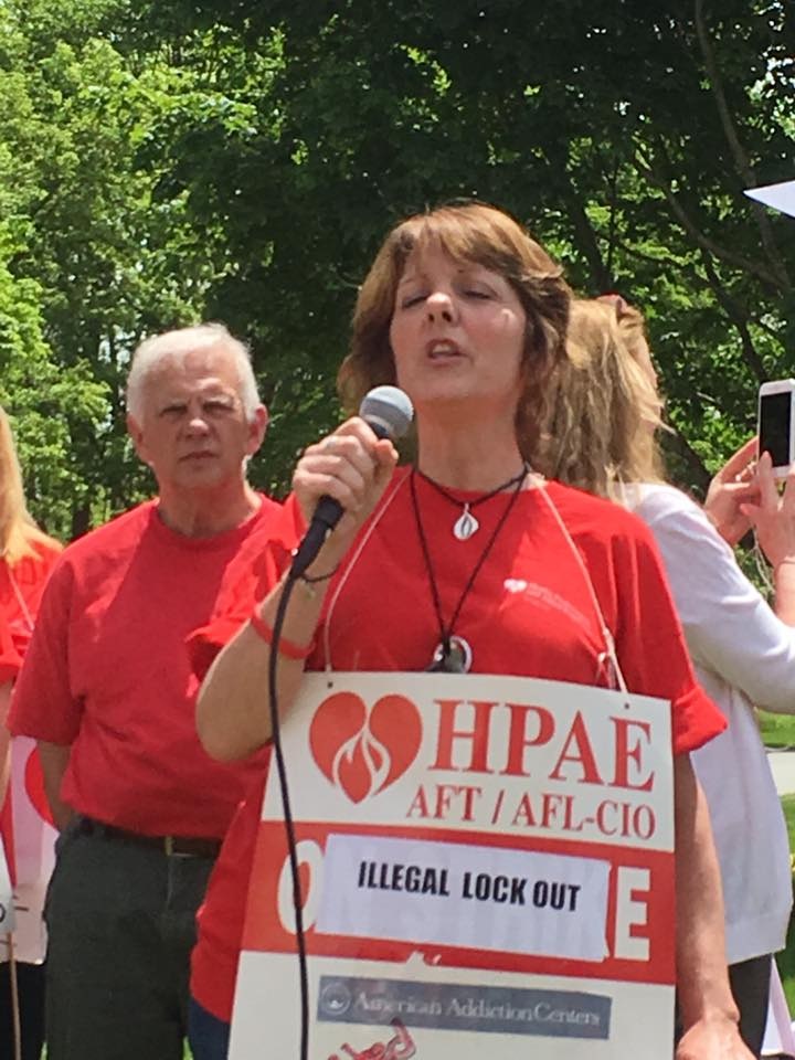 Yesterday, Local 5629 members rallied with members from other HPAE locals, HPAE staff, and union supporters at the entrance to Sunrise House. HPAE President Ann Twomey emphasized our union’s determination to achieve a contract which is good for patients and staff at the facility: “AAC nurses and workers are on the frontlines of the opioid addiction crisis, and are striving to improve safety conditions for patients and workers. This national for-profit chain, AAC, responded with an illegal lock-out, rather than bargain in good faith. Their action is an affront to workers, but also to the residents in need of safe and effective treatment. Despite the lockout, we will continue to bargain for a contract that protects patients and workers,” said Ann Twomey, HPAE President.