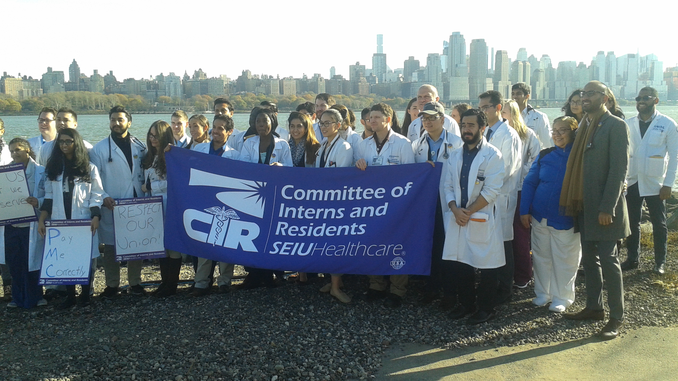 Doctor residents working at Palisades Medical Center/Hackensack Meridian Health rallied yesterday at the hospital to demand a fair contract. The residents are represented by SEIU CIR.